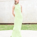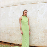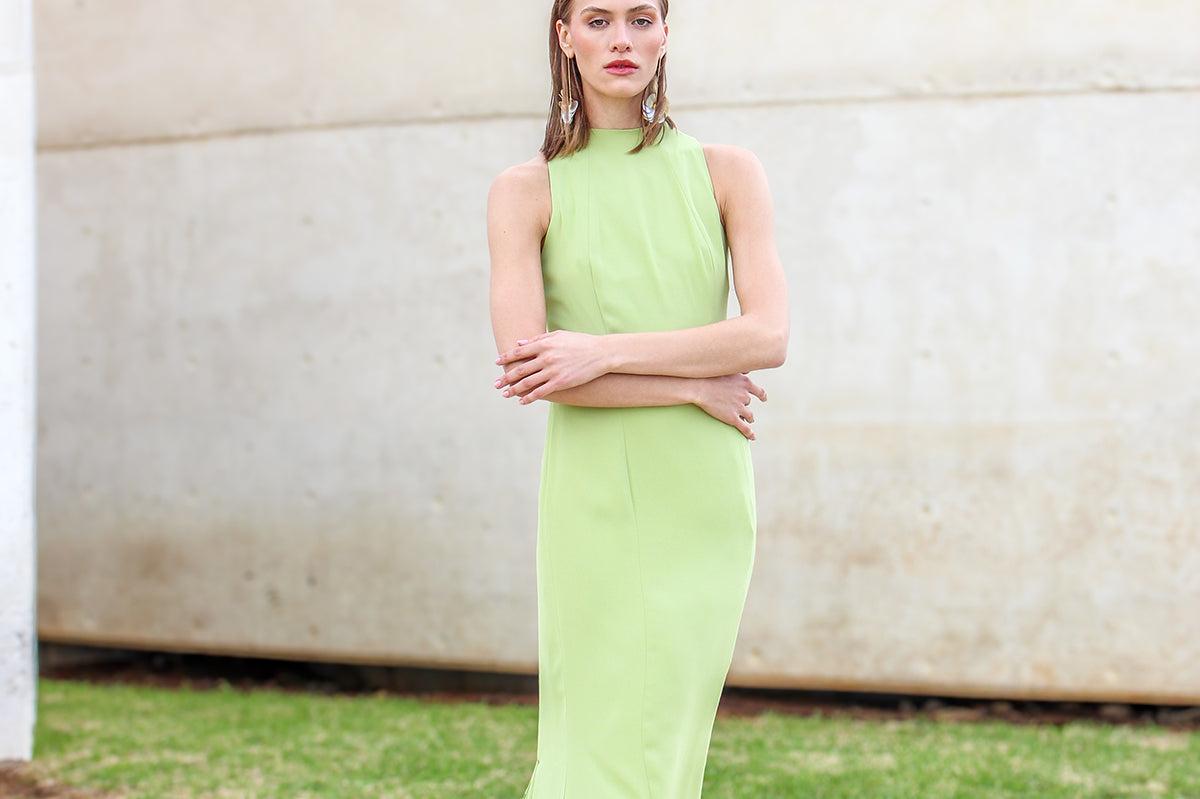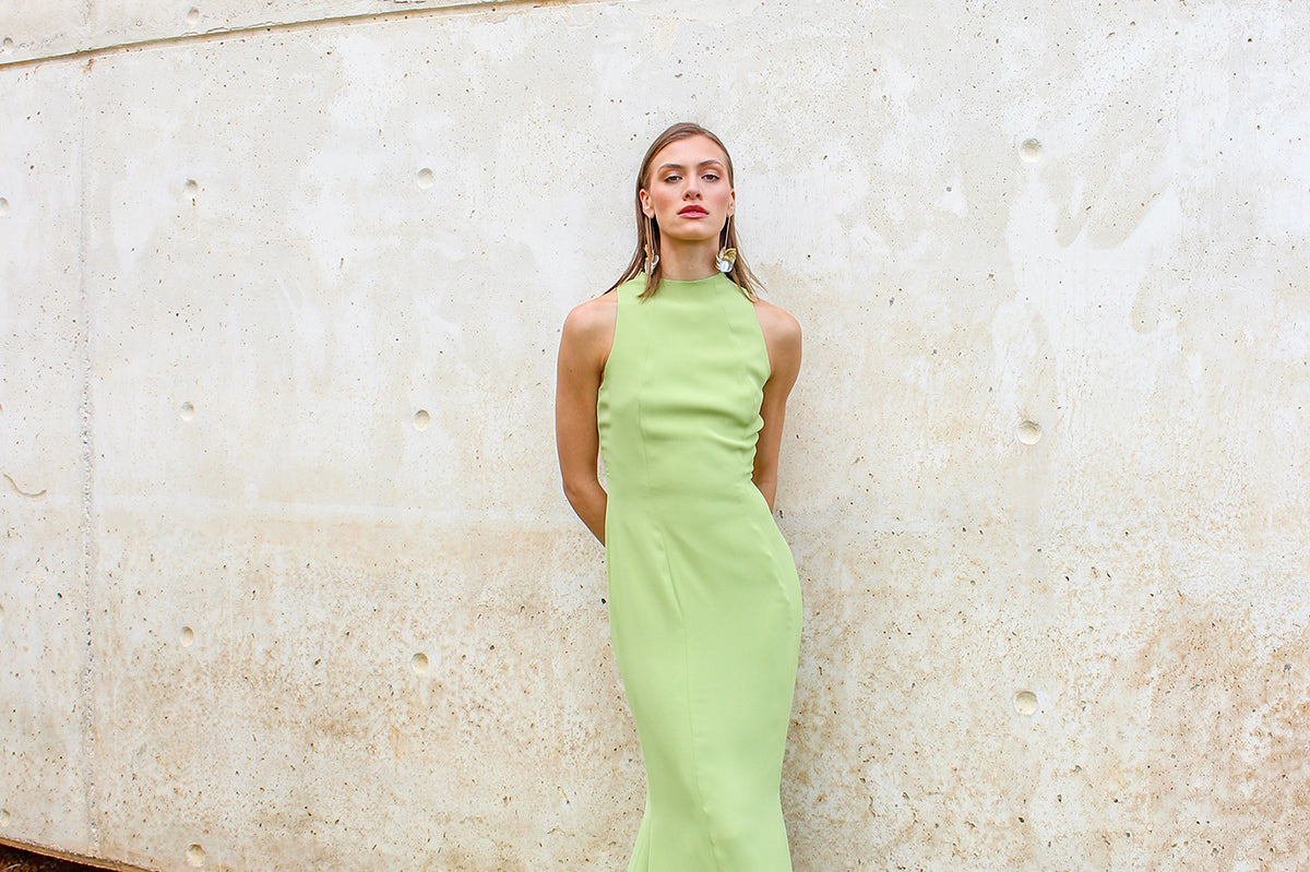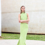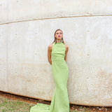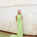 An elegant and regal piece. It features a high neck with a fitted bodice and a long train that elegantly moves with you.