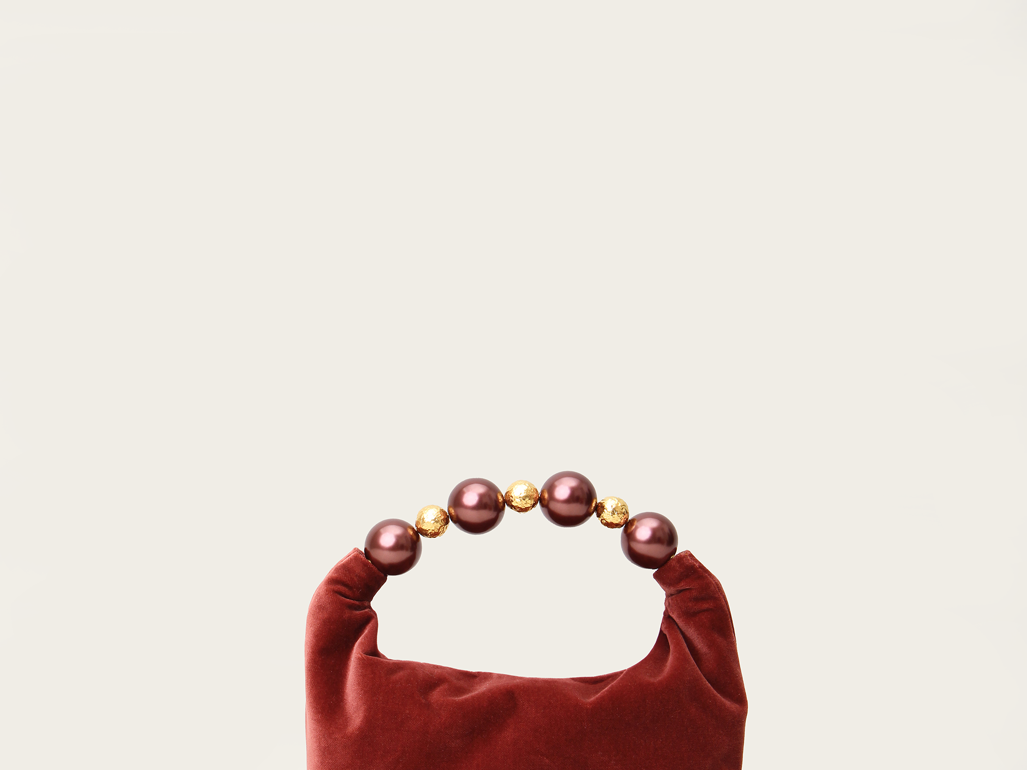 A signature Vanina piece introduced in many versions; from a soft velvet in a sculptural, hollowed shape. It features a magnetic closure and comes with handle adorned with gold-plated foiled beads.