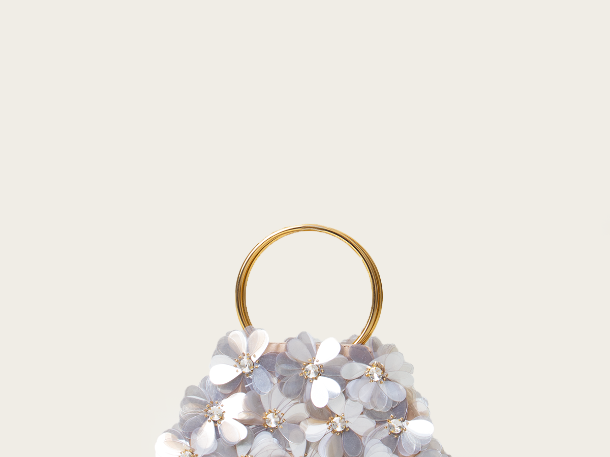 Handcrafted with iridescent sequins blooming around sparkly crystals, this structured piece features a gold handle and brings an interesting three-dimensional texture.