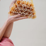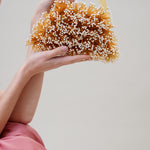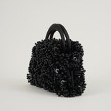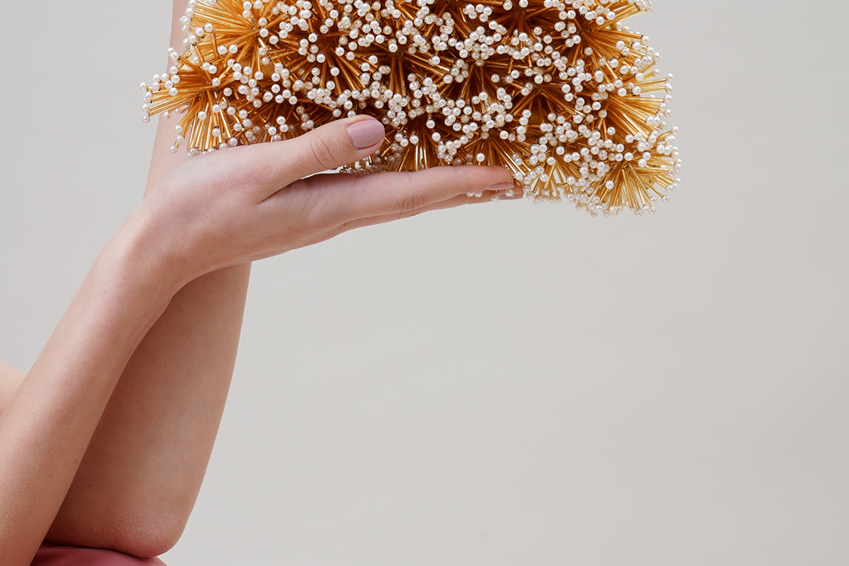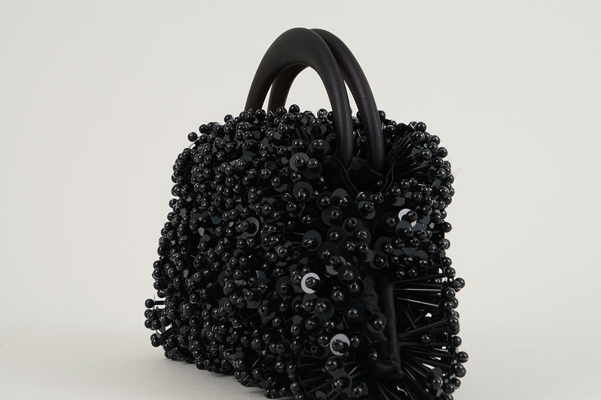 Our 'Pissenlit' piece has it all. A structured and unique satin body overlaid with a myriad of dandelions individually handcrafted with glass beads. The resin handle adds a subtle touch and composition to this statement jewel.