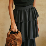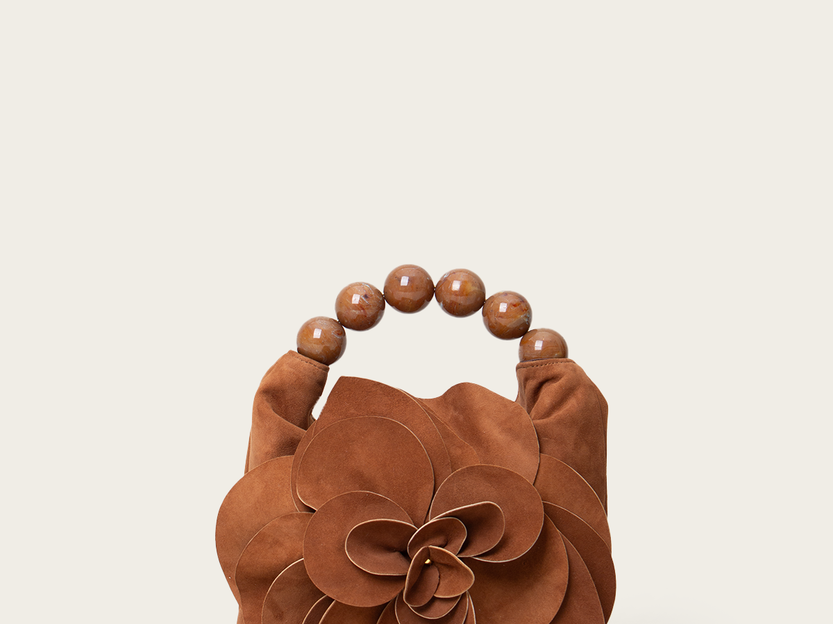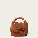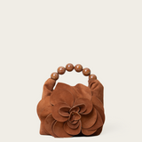 A unique handbag that adds dimension and novelty to your looks. It features handle adorned with textured foiled beads and an oversized handmade flower.