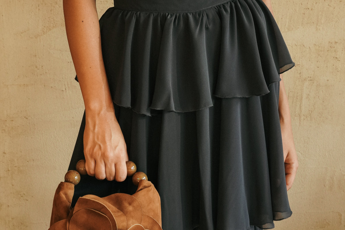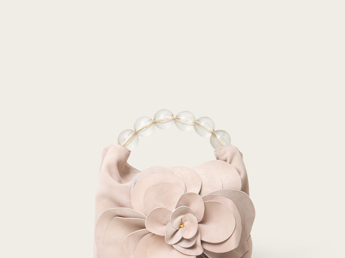 A unique handbag that adds dimension and novelty to your looks. It features handle adorned with textured foiled beads and an oversized handmade flower.