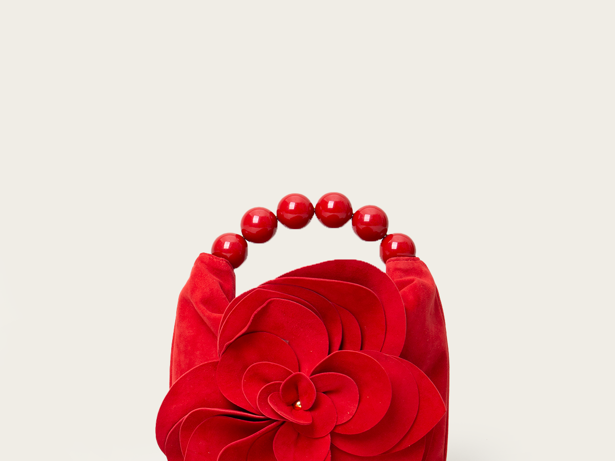 A unique handbag that adds dimension and novelty to your looks. It features handle adorned with textured foiled beads and an oversized handmade flower.