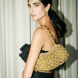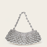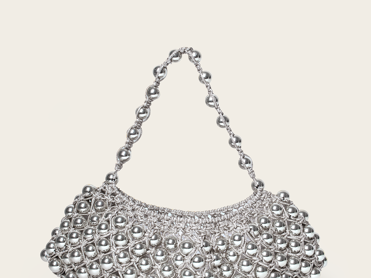 A fun crescent-shaped piece fully hand-crocheted with cotton threads and adorned with glossy oversized beads. A timeless statement bag for the summer season.