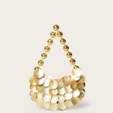 A whimsical piece fully adorned with natural iridescent natural shells that gently jiggle. It is supported by a beaded strap highlighted by glossy beads.