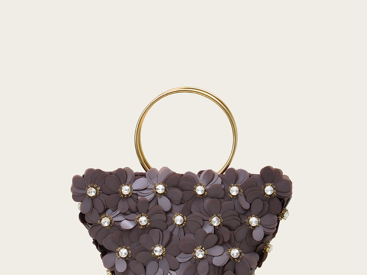 Handcrafted with iridescent sequins blooming around sparkly crystals, this structured piece features a gold handle and brings an interesting three-dimensional texture.