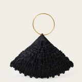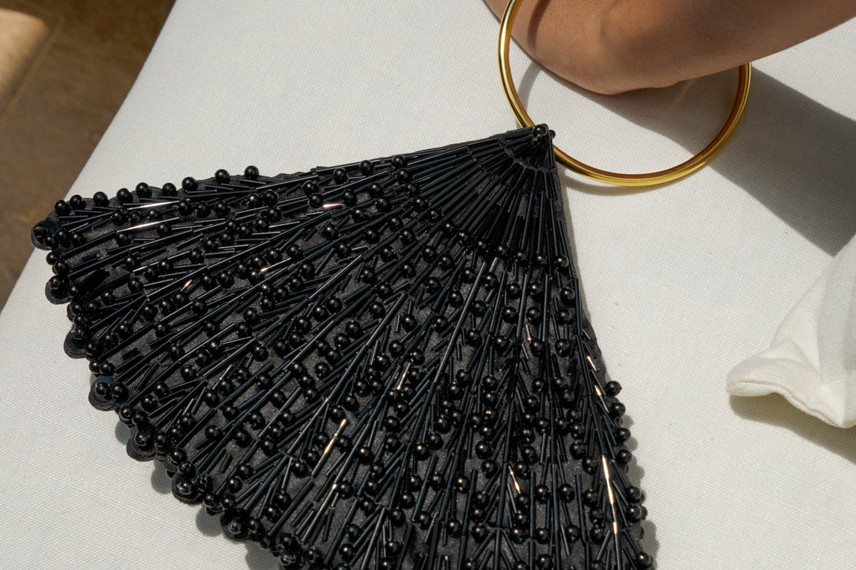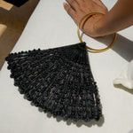 A meticulously handcrafted piece adorned with subtle black tubes and acrylic pearls, creating a sunshine effect. This triangular bracelet bag is easy to carry and comes with a magnetic closure and circular handles.