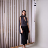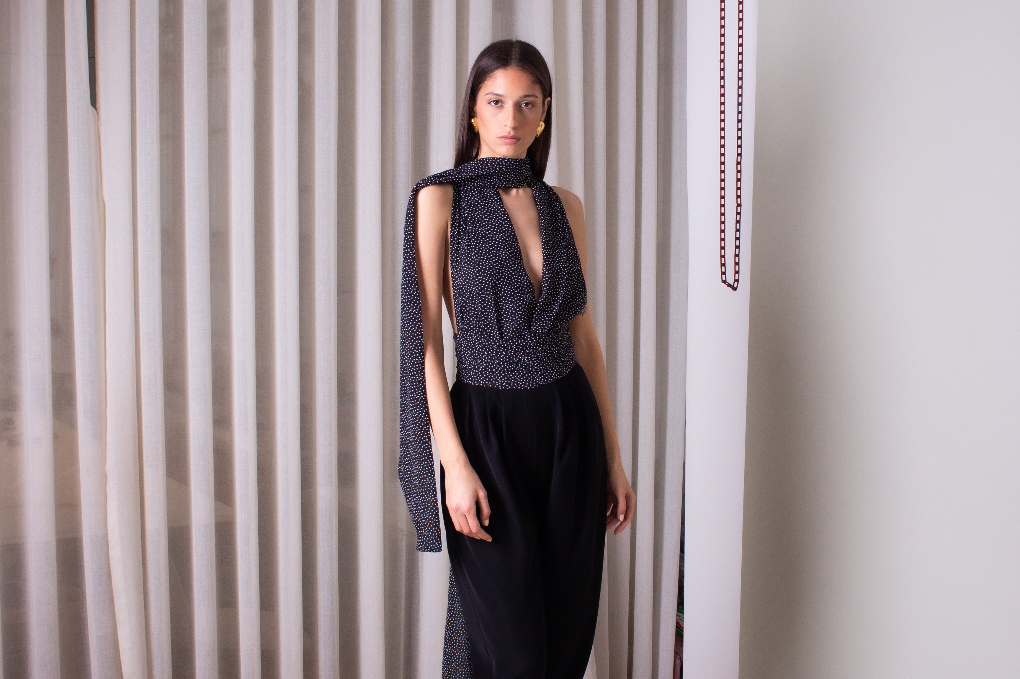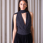 Our 'Papillon' bodysuit reveals a deep V neckline, featuring two front bands that casually wrap around the neck, for a comfortable fit.