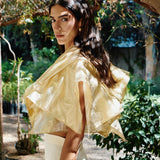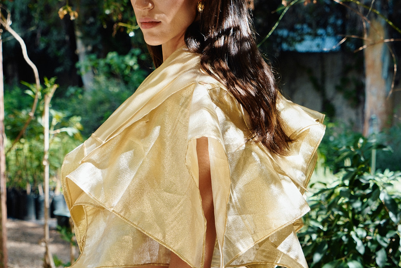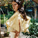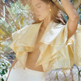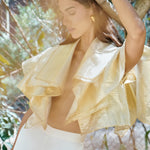 A bolero inspired by the Fall foliage. Crafted in a lustrous organza material, it features cascading oversized ruffles, adding drama around the shoulders.