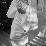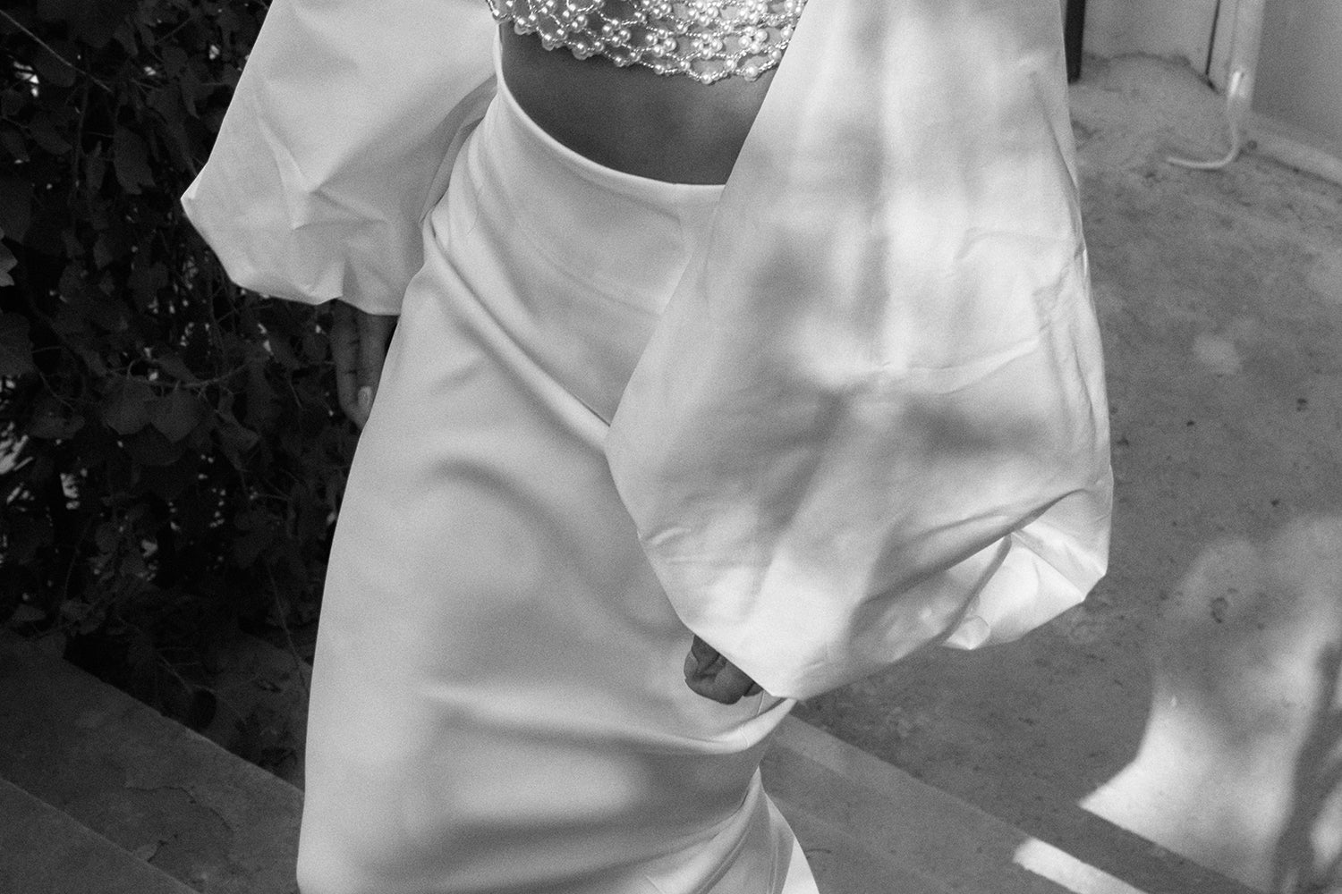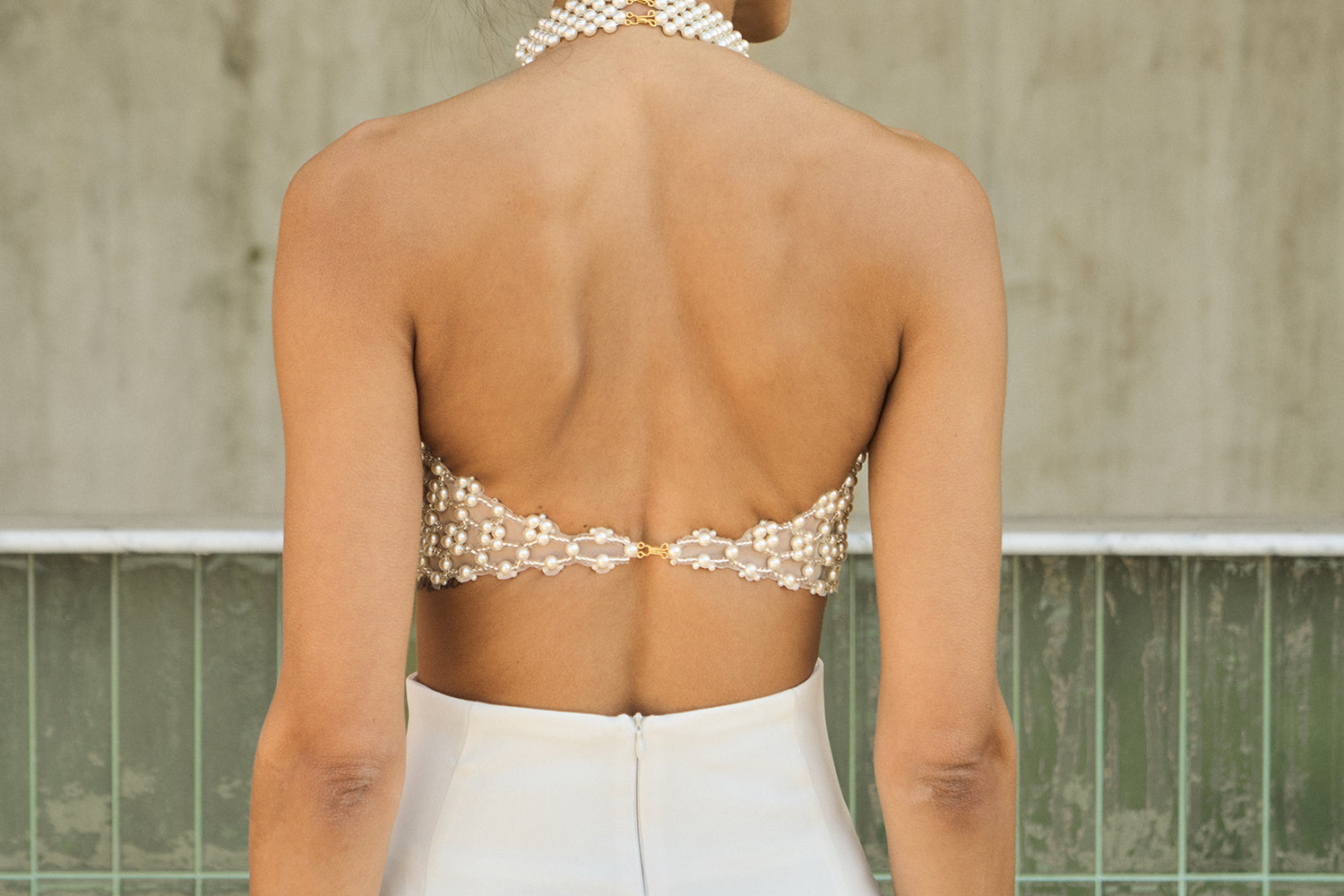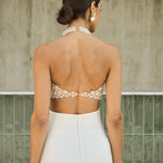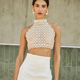 Our 'Adage' bustier features Vanina's signature beading technique. Entirely handmade in off-white acrylic and glass beads, it's a light and eclectic piece, sewn on an organza lining. It's the ideal statement to your wedding events! .