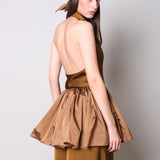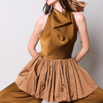 A versatile and fun piece that adds dimension to your outfit. The 'Parasol' bustier is a high-neck draped cut with an open back and a ruffled hem.