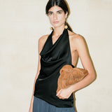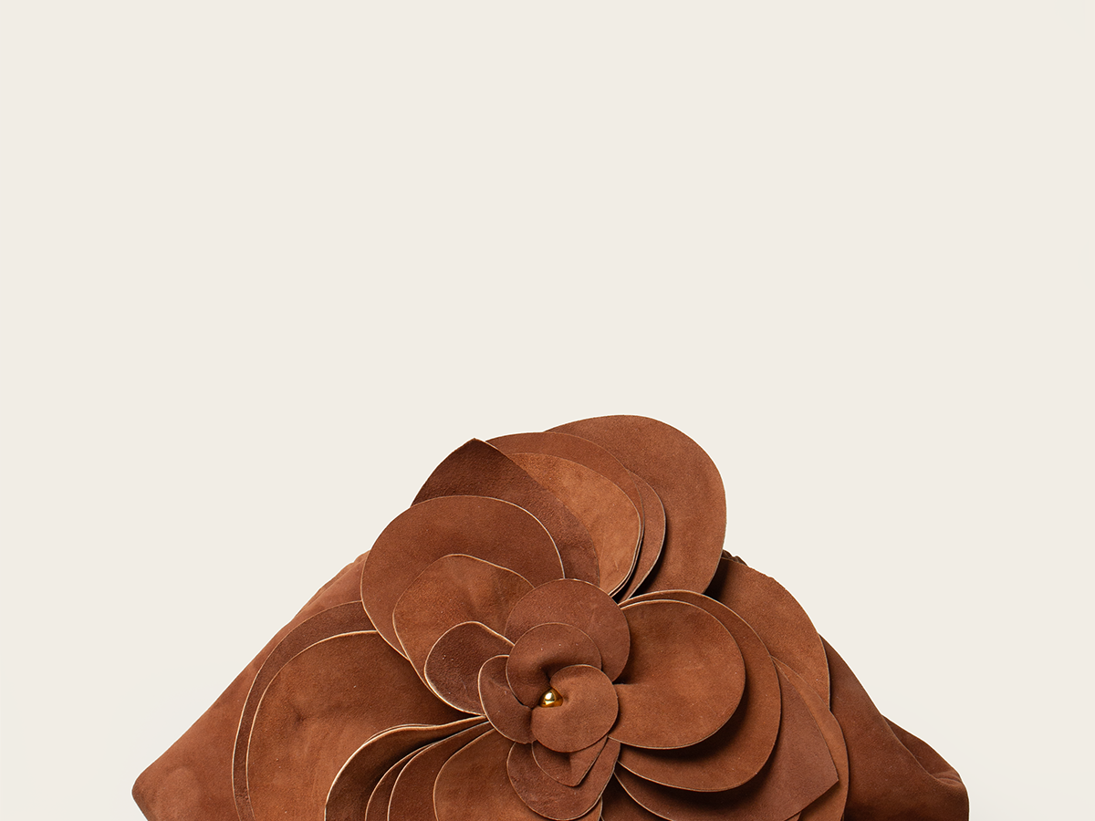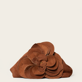 The 'Rendez-Vous' clutch, now comes in a soft Suede, artfully shaping an oversized handmade flower. Evoking a blooming rose, it brings a touch of romance and sophistication to your outings.
