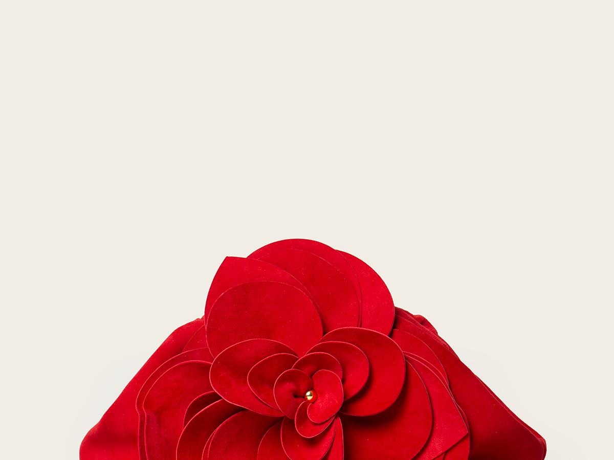 The 'Rendez-Vous' clutch, now comes in a soft Suede, artfully shaping an oversized handmade flower. Evoking a blooming rose, it brings a touch of romance and sophistication to your outings.