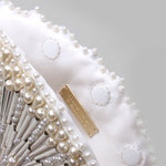 An arch-shaped evening clutch, handcrafted with delicate pearls of various shapes, with a sleek magnetic closure. Its intricate silver and gold beading creates a subtle, radiant sparkle, perfect for an elegant touch.