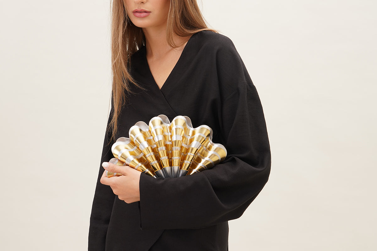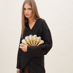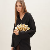 Artfully forming a layered seashell shape, this clutch evokes coastal charm and organic elegance. It is delicately handcrafted with a leather-like material in metallic gold and silver.