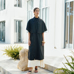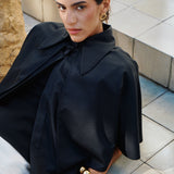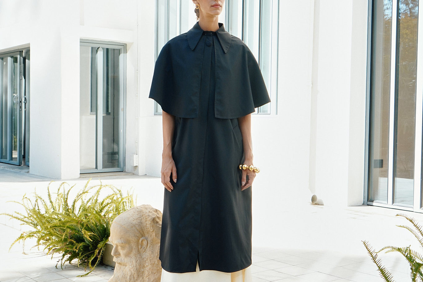 A vintage-inspired full-length coat with a cape that drapes over the shoulders. It features a traditional structured collar with a top button.