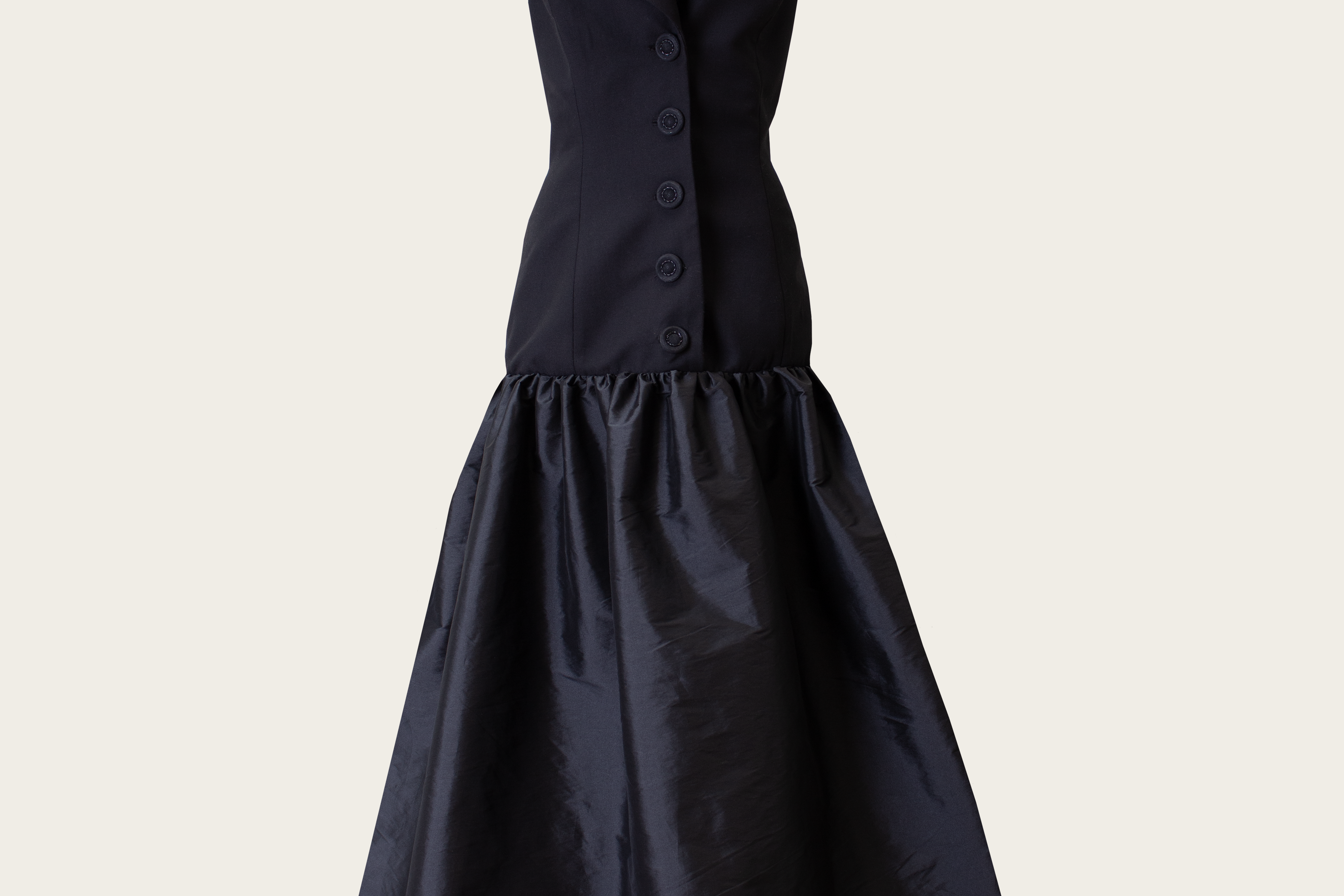 A blazer dress unlike any other! The 'Bianca' dress is a sleeveless piece with peak lapels and voluminous skirt, adorned with oversized buttons.