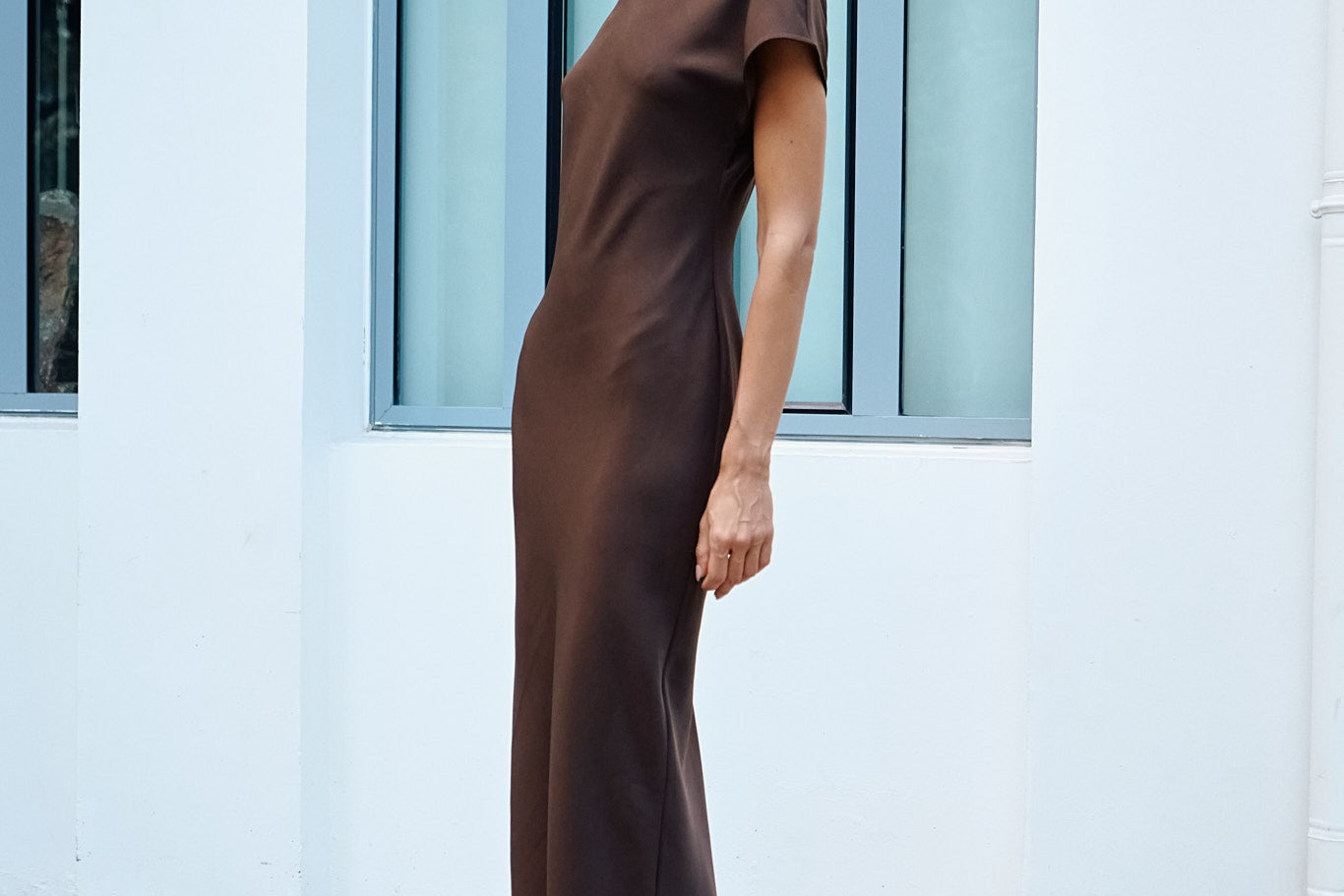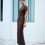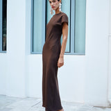 A chic and straight silhouette with a mock neck and accentuated short sleeves. The waist is visibly cinched, and the maxi length adds more allure.