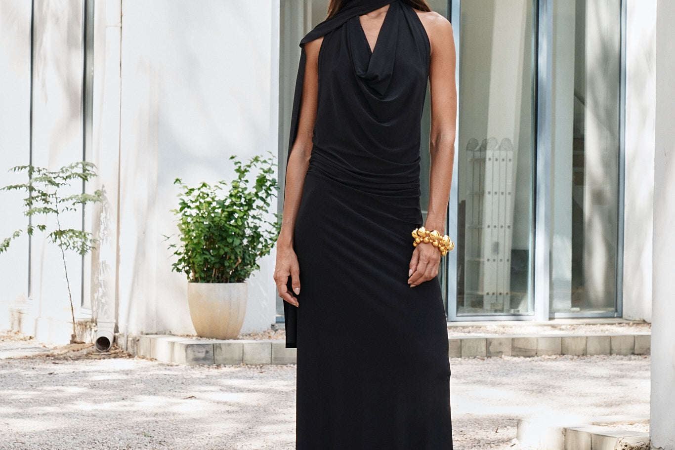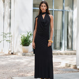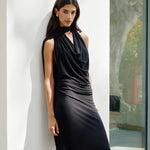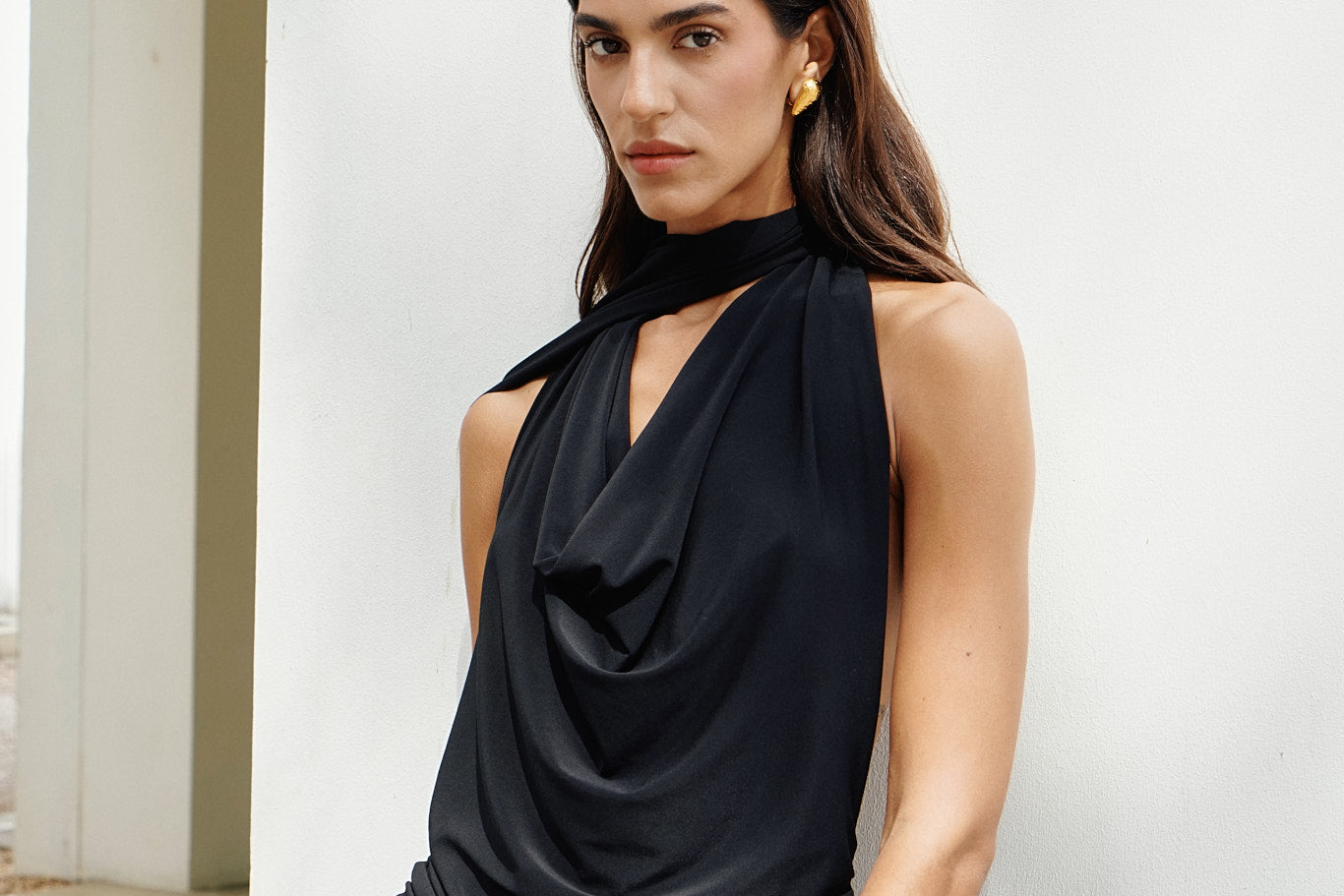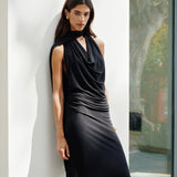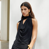A draped piece with a cowl neckline creating soft folds on the bodice. Crafted with stretchy fabric, it features an asymmetrical design and flowing drape that can wrapped around your neck.