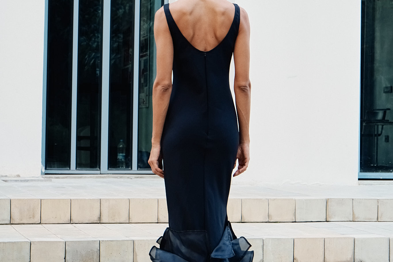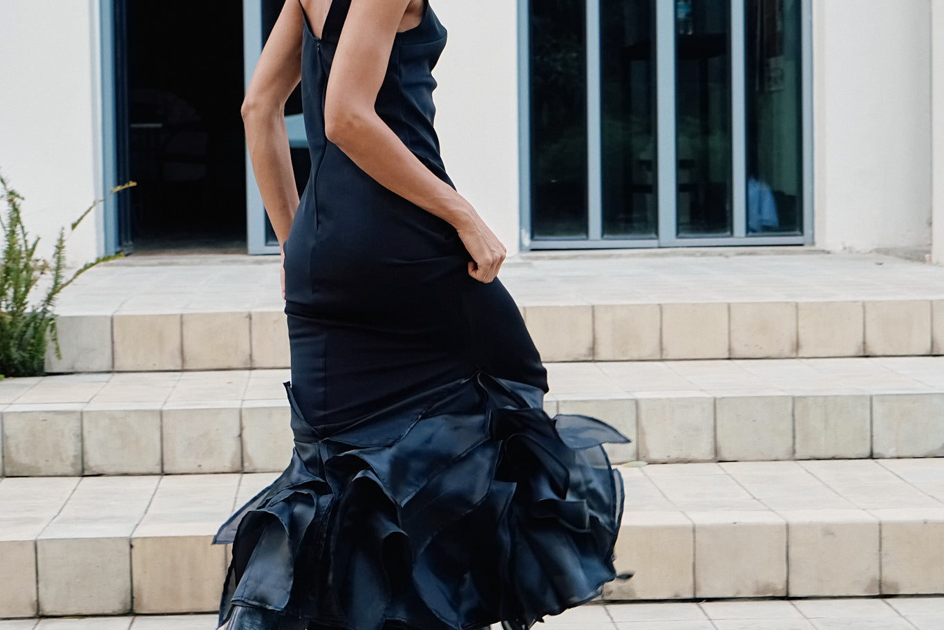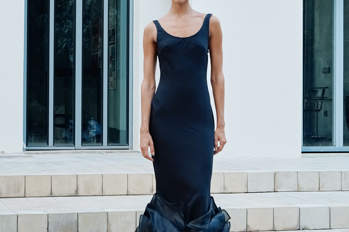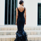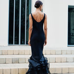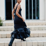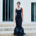 A piece inspired by the Fall foliage. With a straight maxi and a plunging neckline, this dress is highlighted by cascading oversized ruffles at the hem, adding dramatic texture.