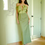The 'Gardenia' dress is a strapless piece featuring a plunging neckline and ruffle detailing applied to the bust, completed with a straight skirt. It is cut from silk taffeta and cotton canvas, creating a soft contrast.