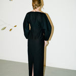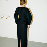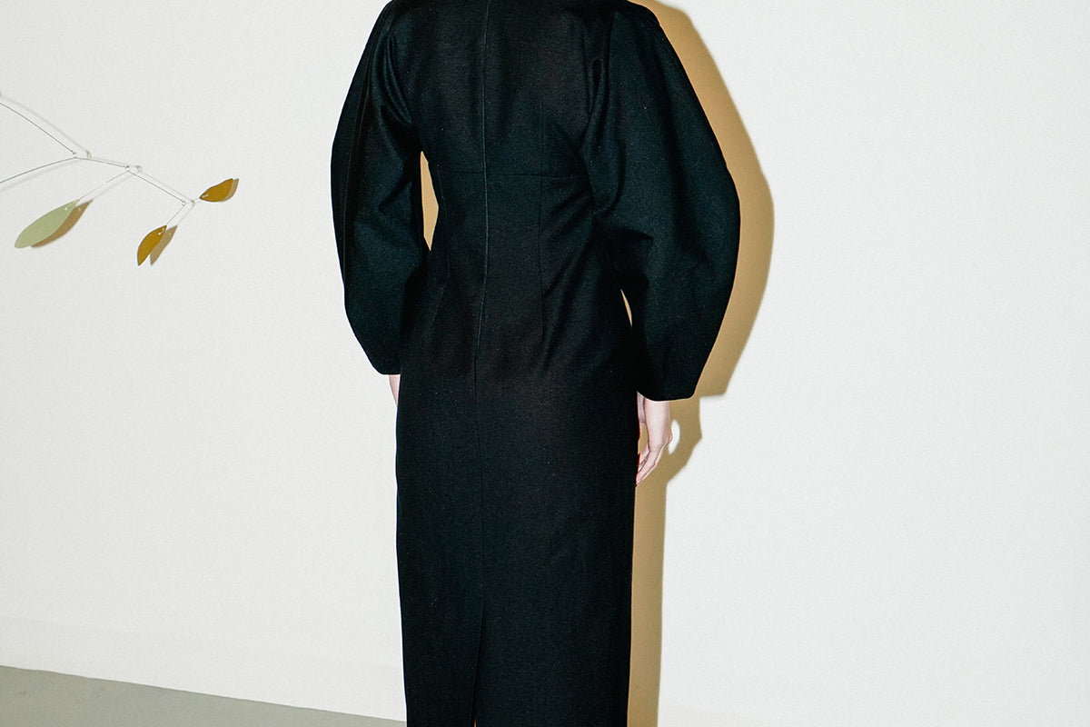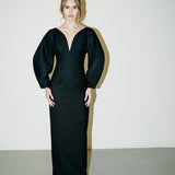 A deep V piece with curved long sleeves and a fitted bodice and a straight skirt.