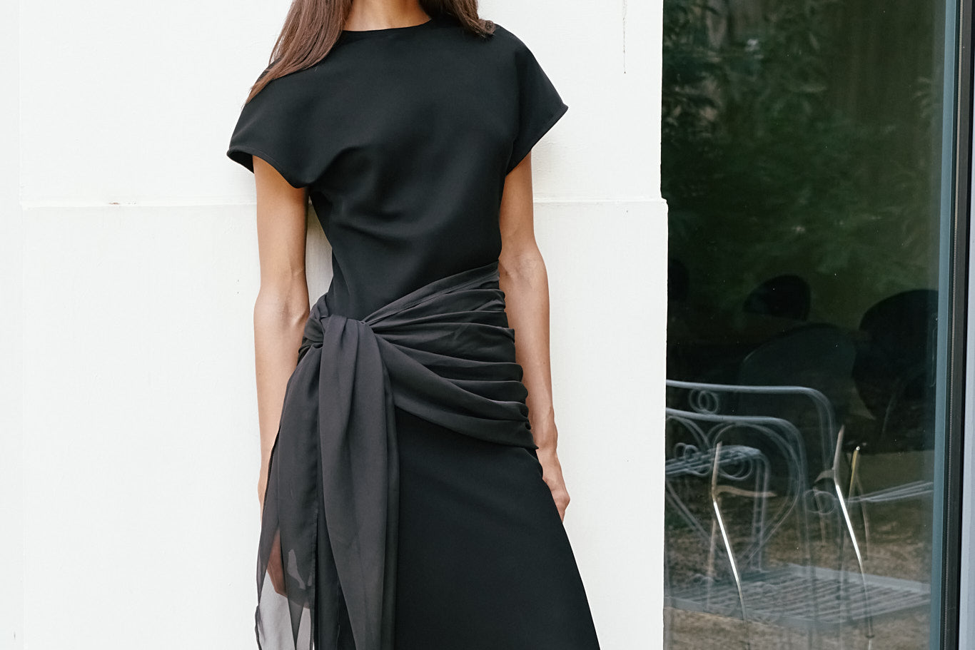 A chic and maxi silhouette with a mock neck and accentuated short sleeves. The waist is visibly cinched and is adorned with a flowing sash that can be gracefully tied or loose.