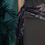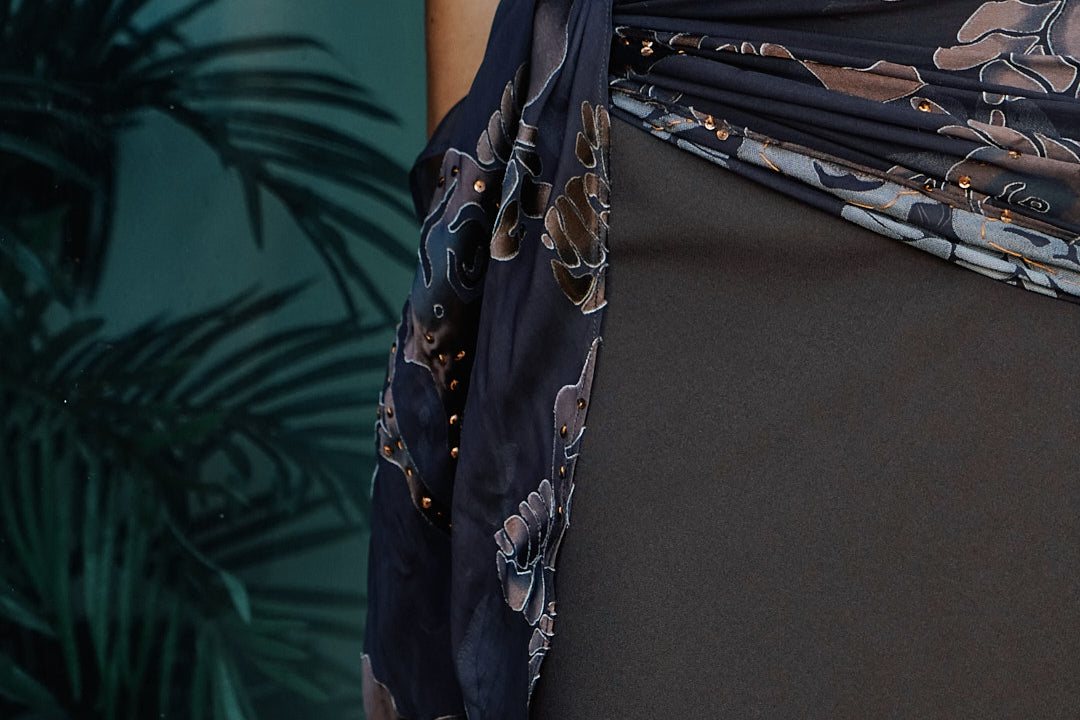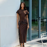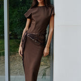 A chic and maxi silhouette with a mock neck and accentuated short sleeves. The waist is visibly cinched and is adorned with a flowing sash that can be gracefully tied or loose.