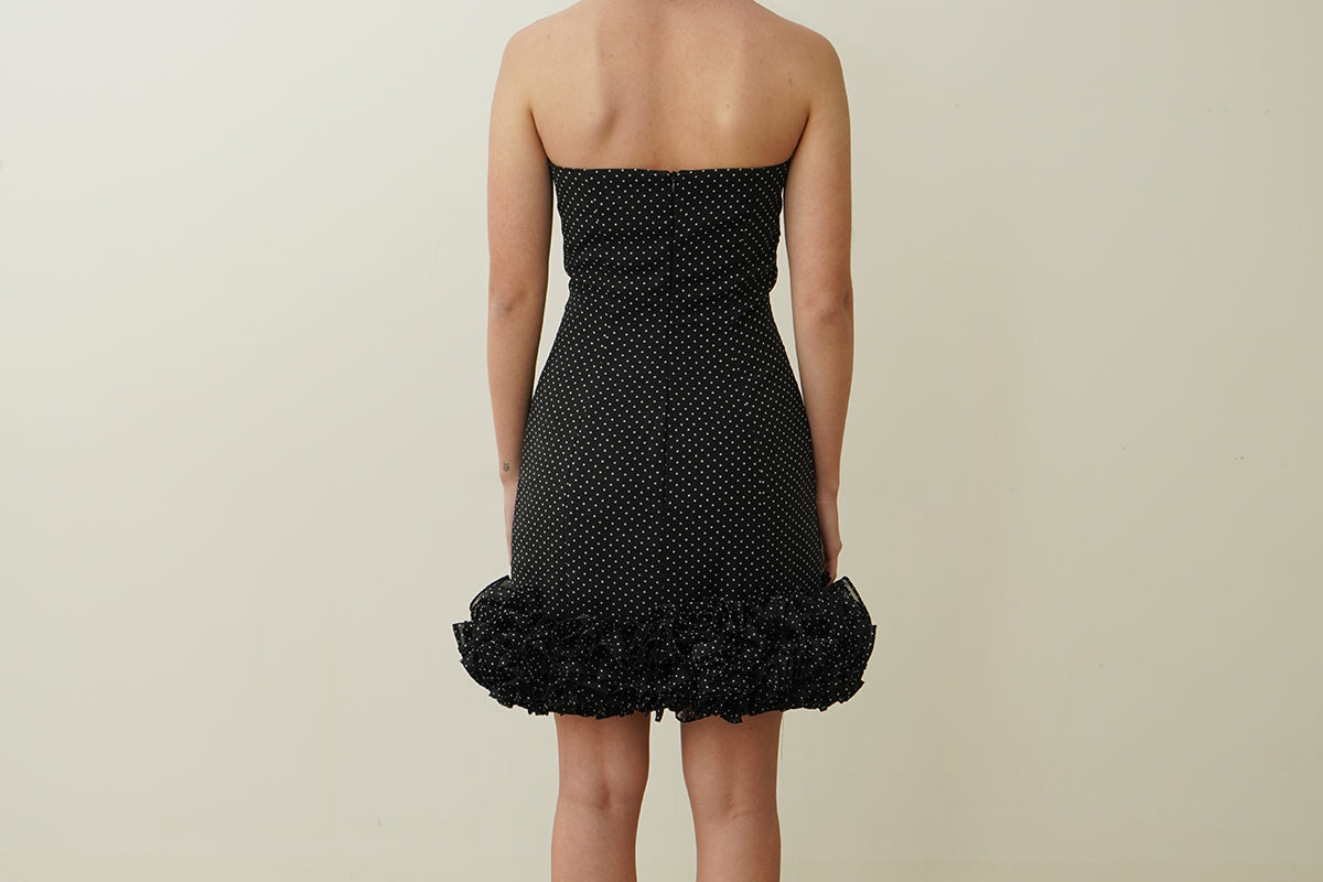 A fun and coquette piece that speaks for itself. Crafted with a light mousseline fabric, it's a mini strapless silhouette with layers of gathered ruffles at the hem.