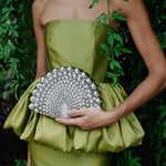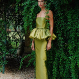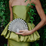 Inspired by the blooming tulip flower, this satement piece is a strapless floor-length dress featuring bell-shaped ruffles on the bodice.