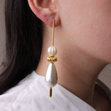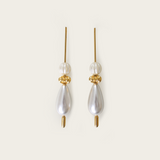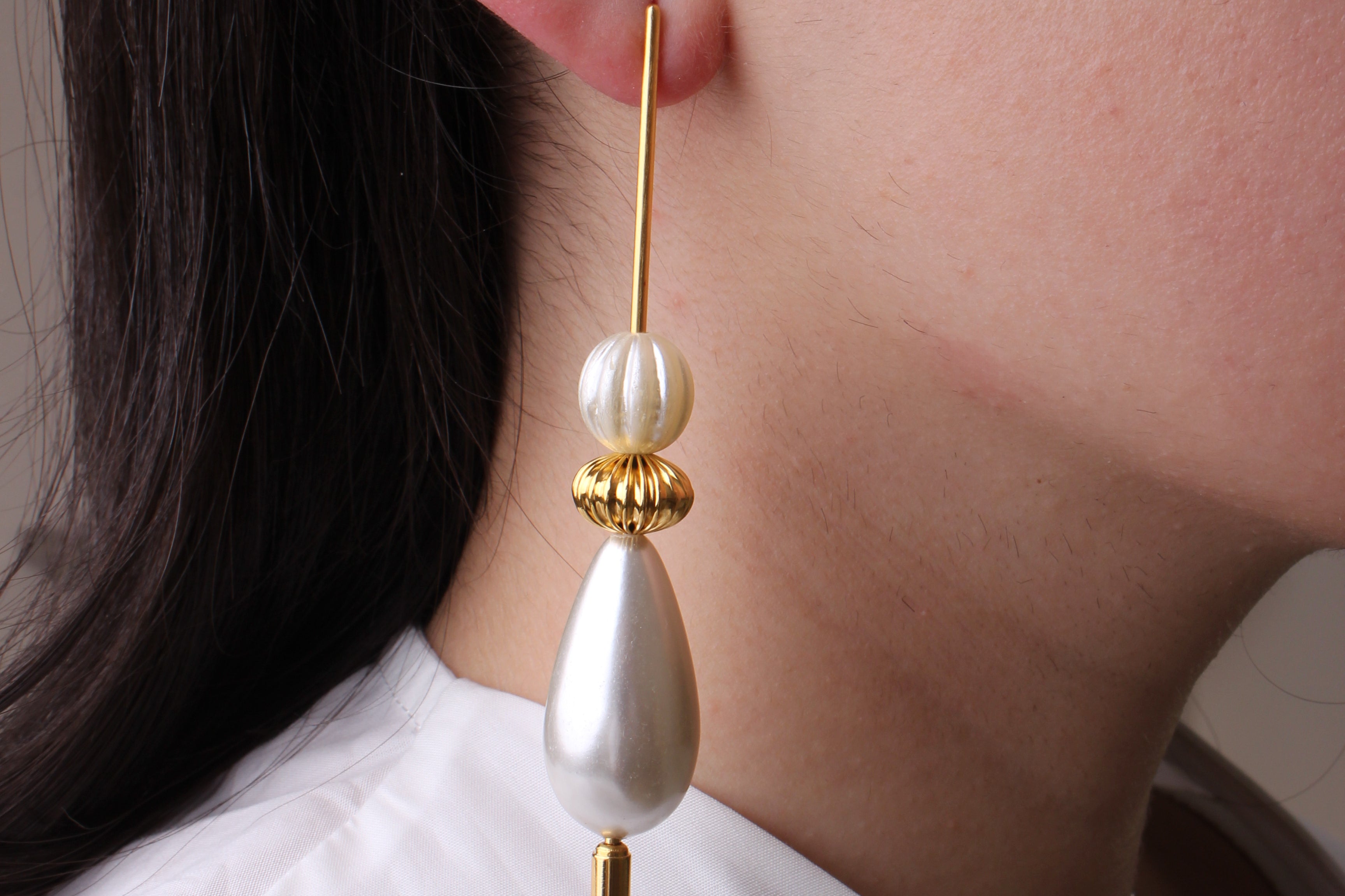 A simple and modern pair with flair. These pairs of earrings are light and dangly; they are made with gold-plated brass stems that carry geometric acrylic beads.