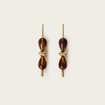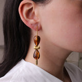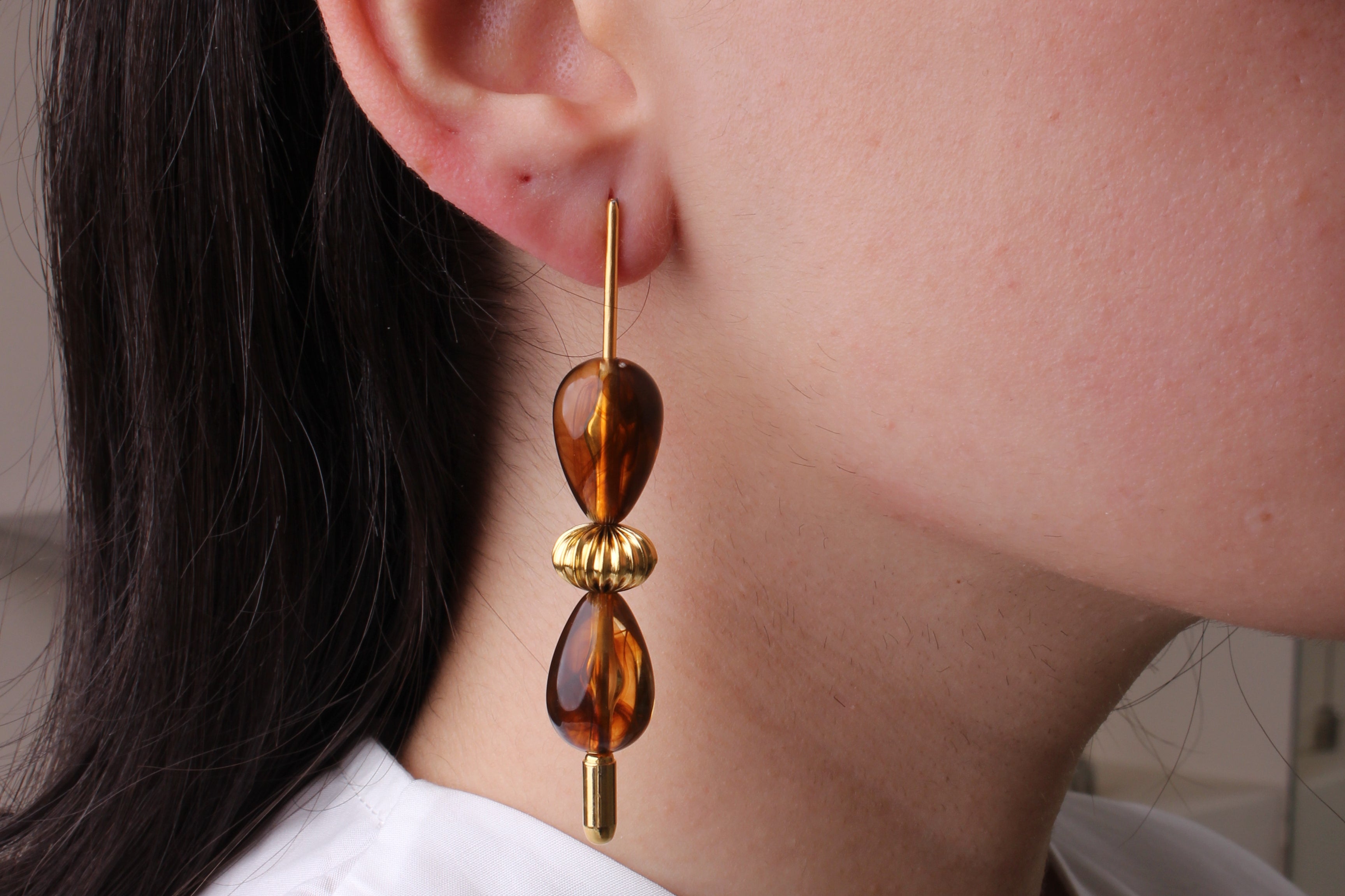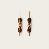 A simple and modern pair with flair. These pair of earrings are light and dangly, they are made with gold-plated brass stems that carry geometric acrylic beads.