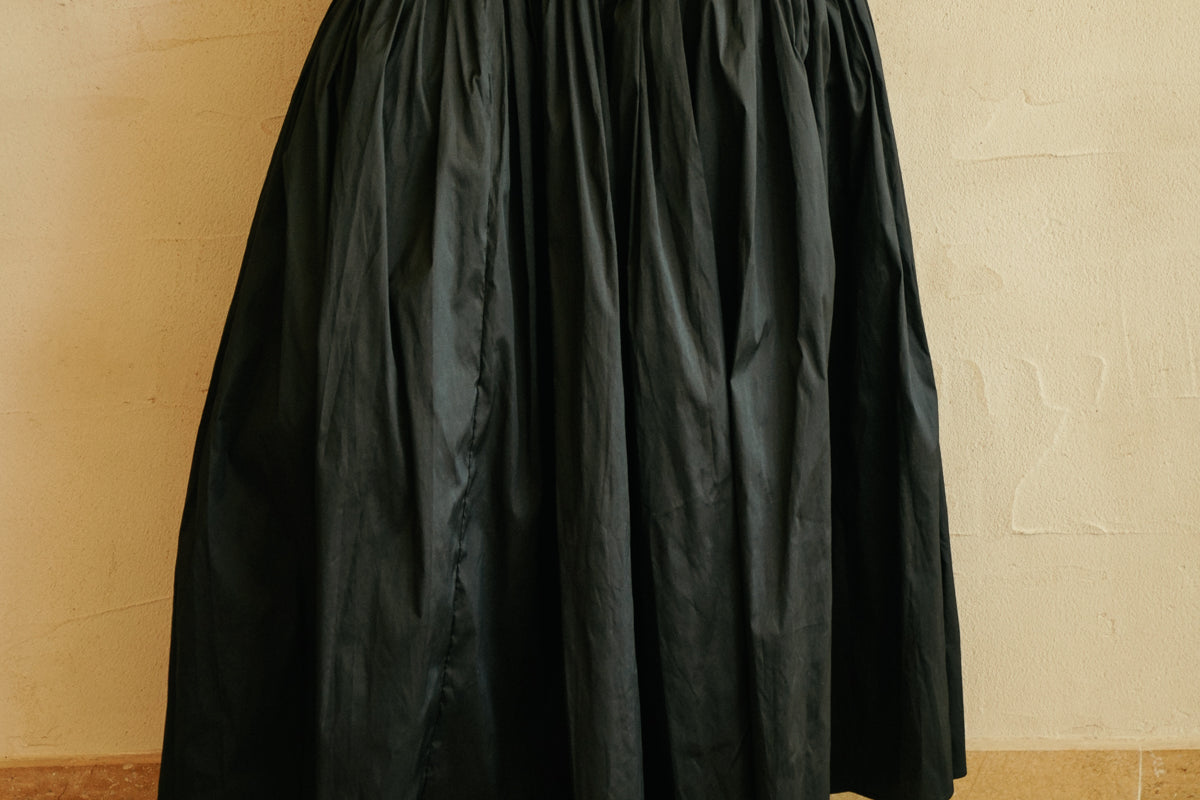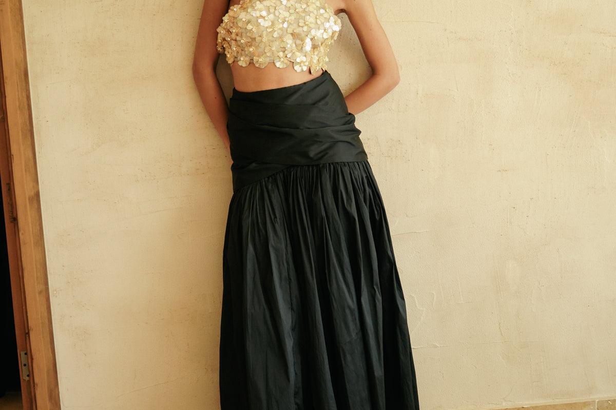 Meet our latest 'Gondole' skirt, a statement skirt cut from silk taffeta. Draped at the waist and flared hem, it has a dramatic allure and moves beautifully as you walk.