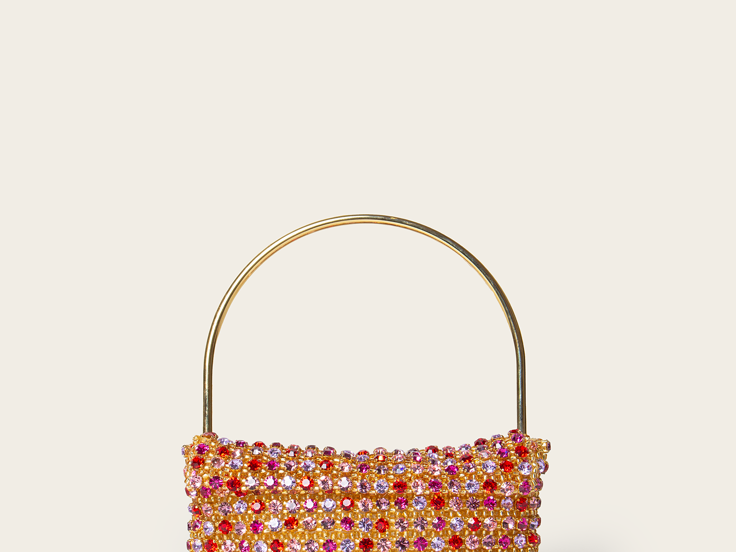 Our latest version of the 'Diademe' collection come in a wider baguette shape. It is fully handcrafted with Swarovski crystals, with a flap closure and a gold-plated handle.