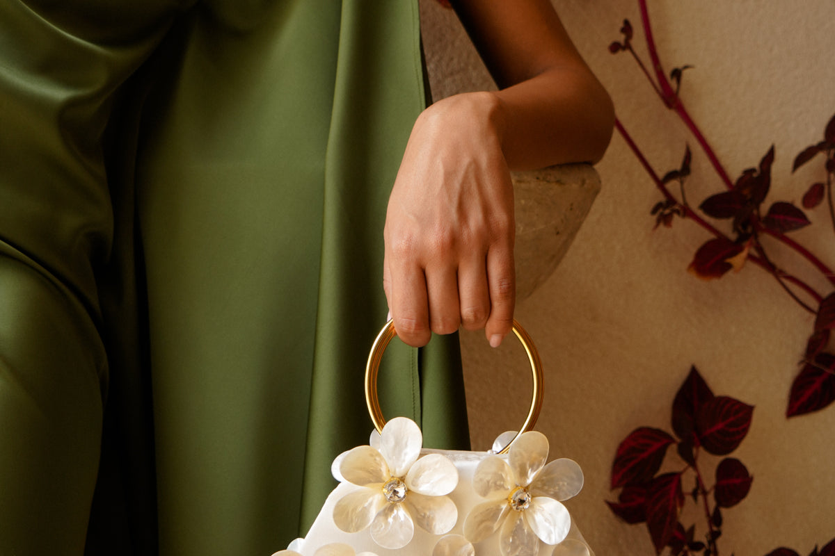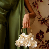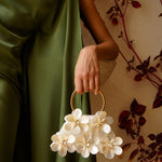 Introducing our Fleurs Blanches bag, handcrafted with mother-of-pearl shells blooming around sparkly crystals and featuring a resin handle. With its intricate three-dimensional texture, this bag adds a touch of shimmery romance to any outfit.