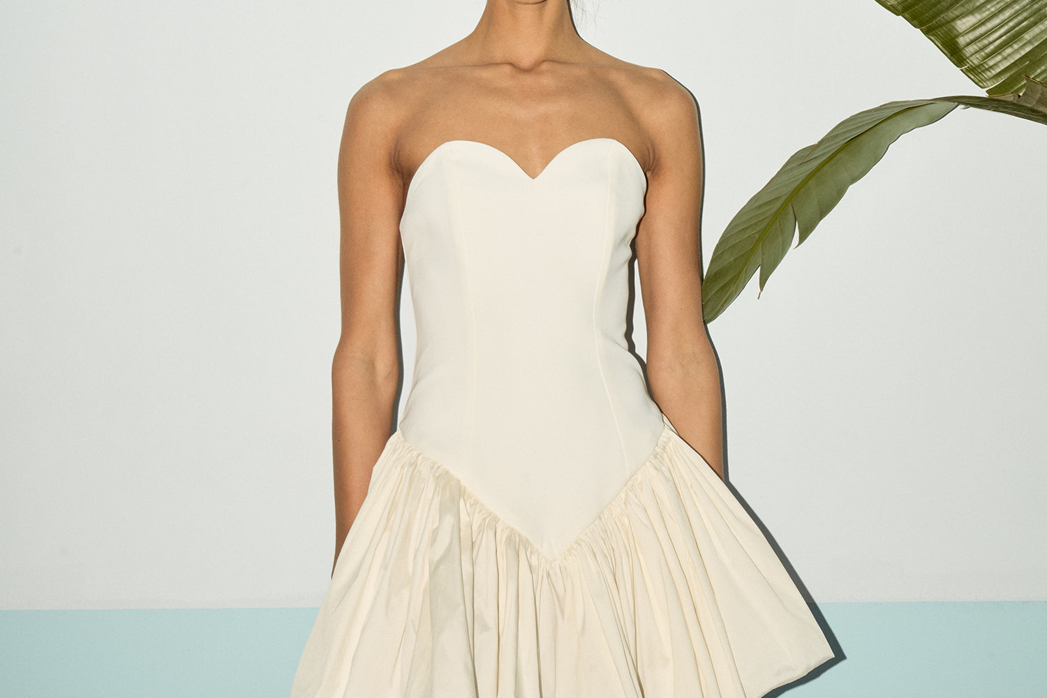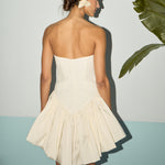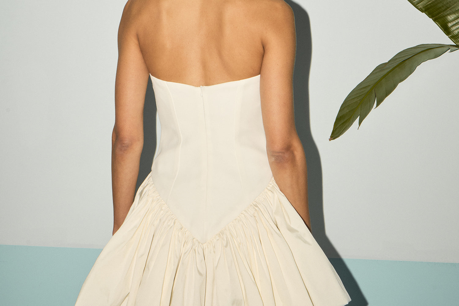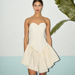 A bridal after-party staple; A mini dress with a flirty edge. It features a sweetheart neckline with a corseted bodice and a ruffled asymmetrical skirt.