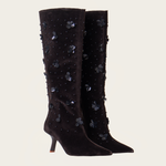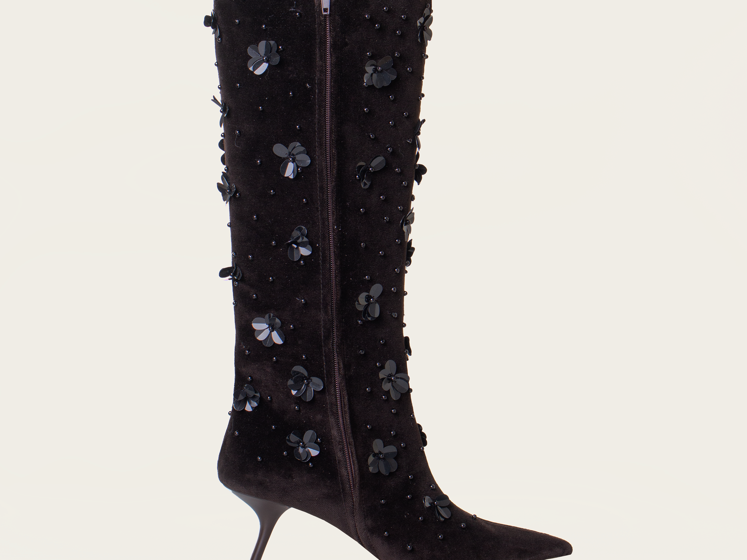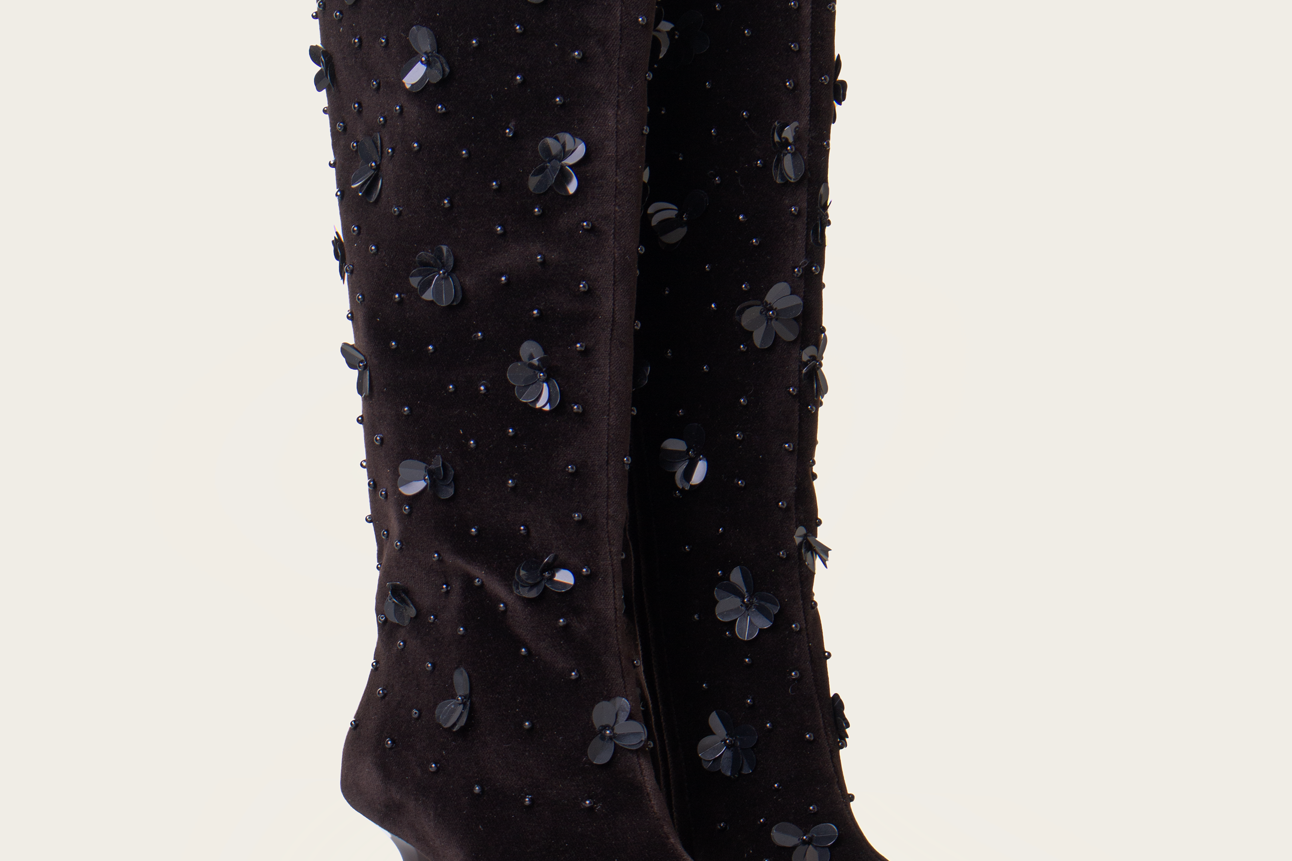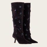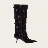 A flower garden on your feet. The 'Jardin Enchante' boots have a mid-calf length and sharp pointed toe; completely embellished with beaded flowers and crystal details with a side zipper.