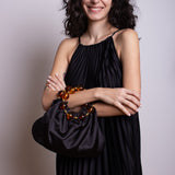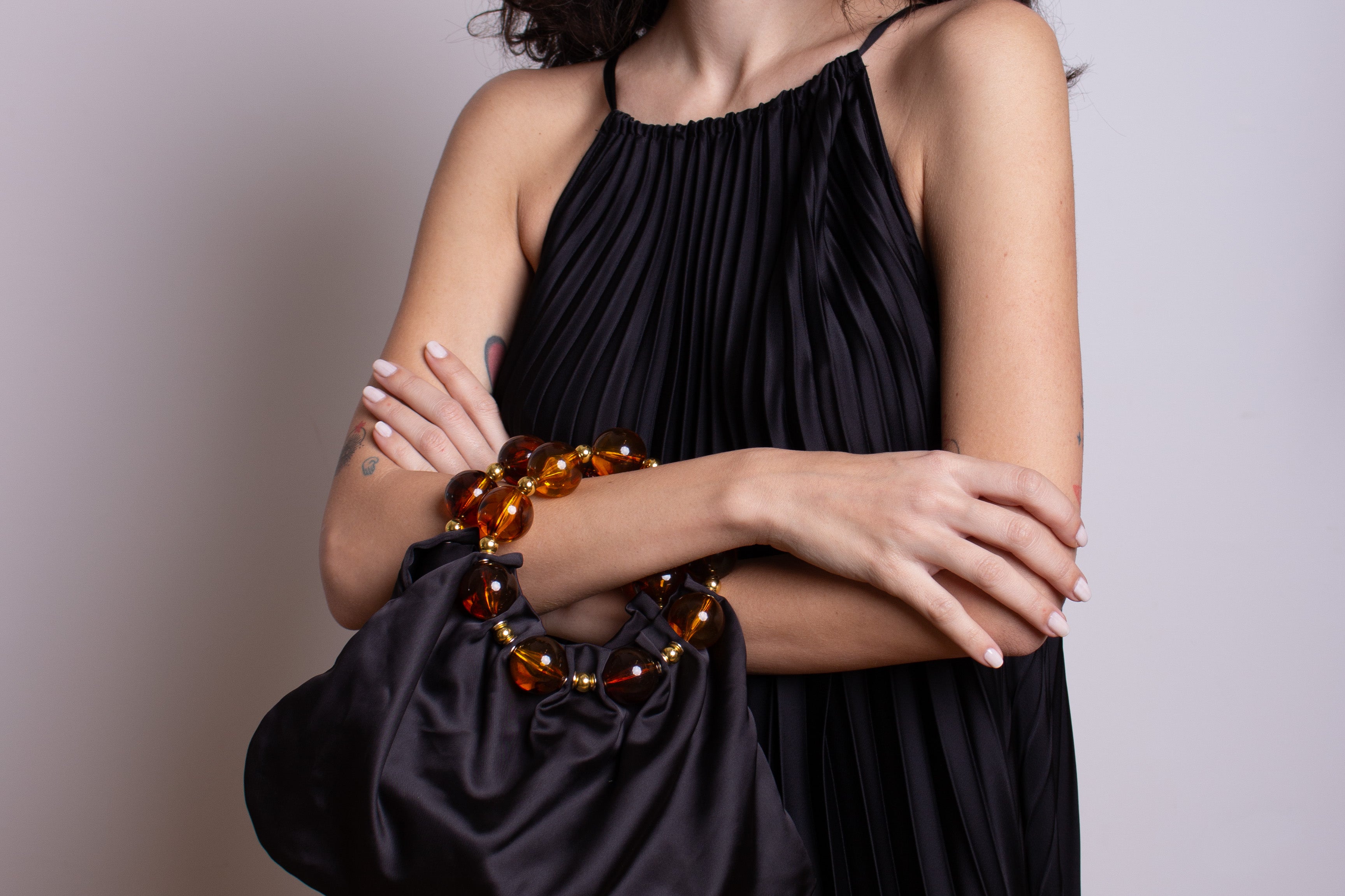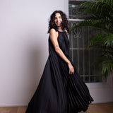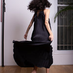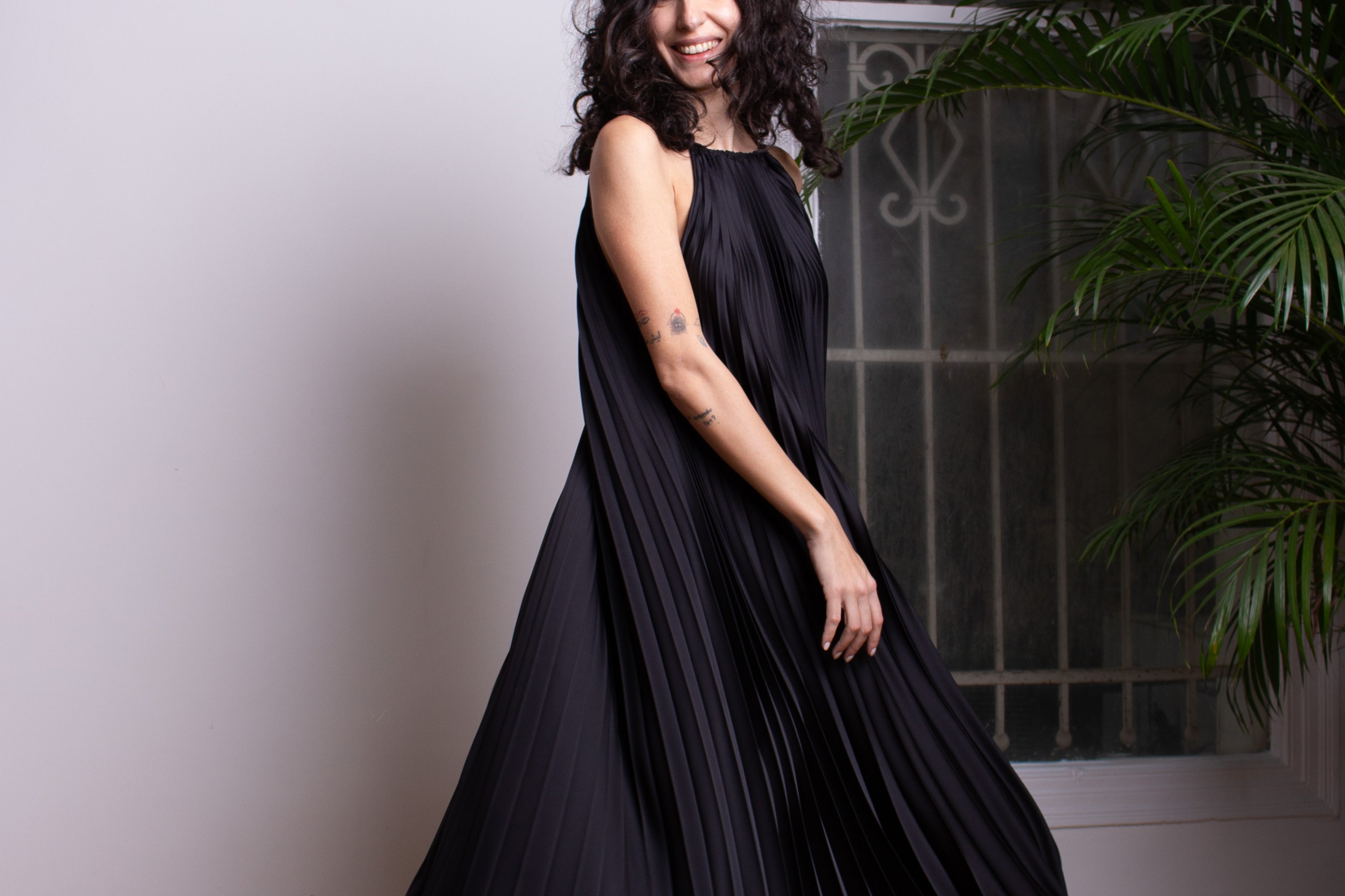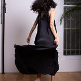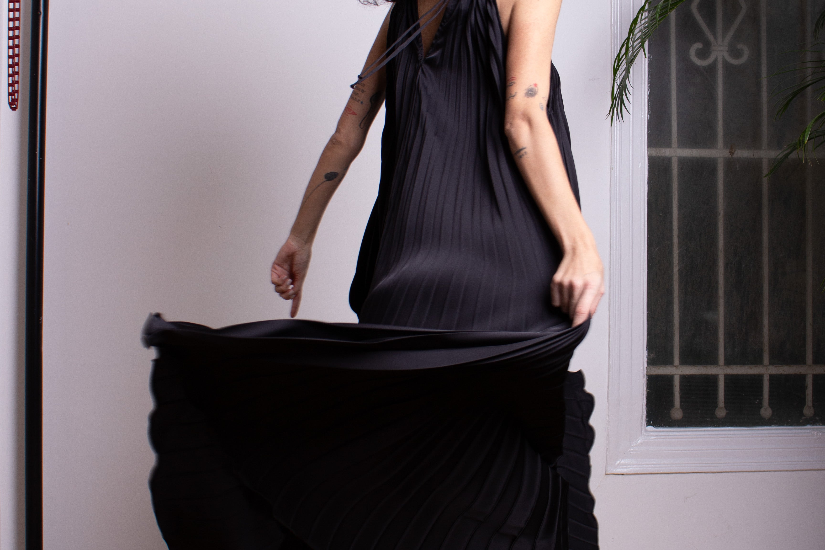 A size-free flared dress in pleated satin that can be adjusted on the neck