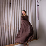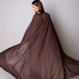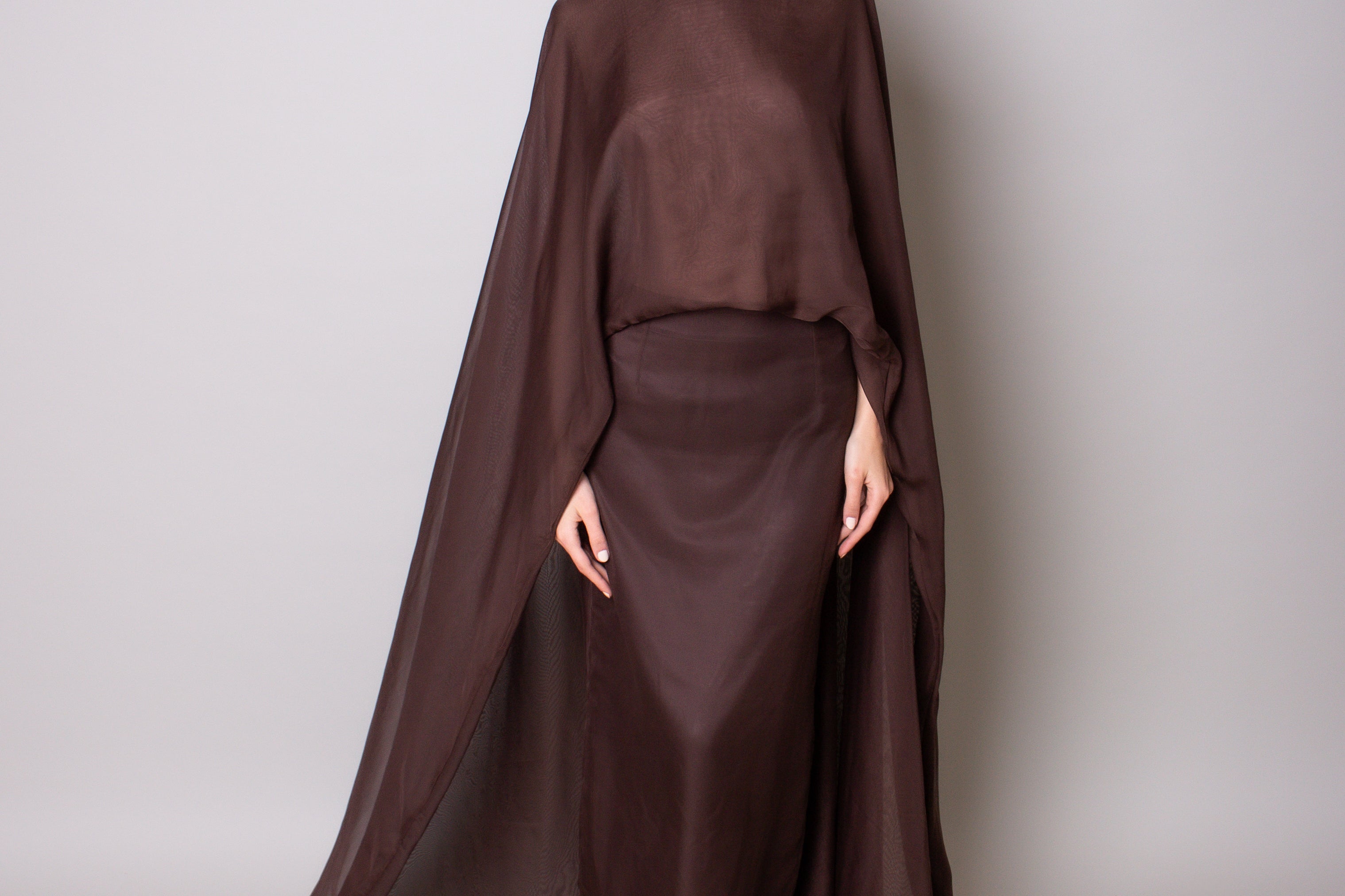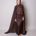 A refined set crafted with an airy mousseline material. It features an asymmetrical off-the-shoulder poncho and a long flowy skirt.