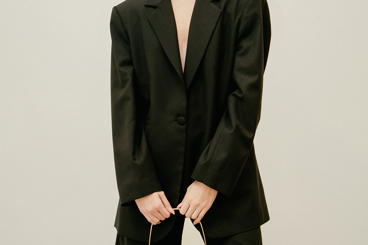 A tailored set featuring oversized bermuda shorts and a structured blazer, crafted with a light mid-seasonal fabric.