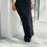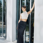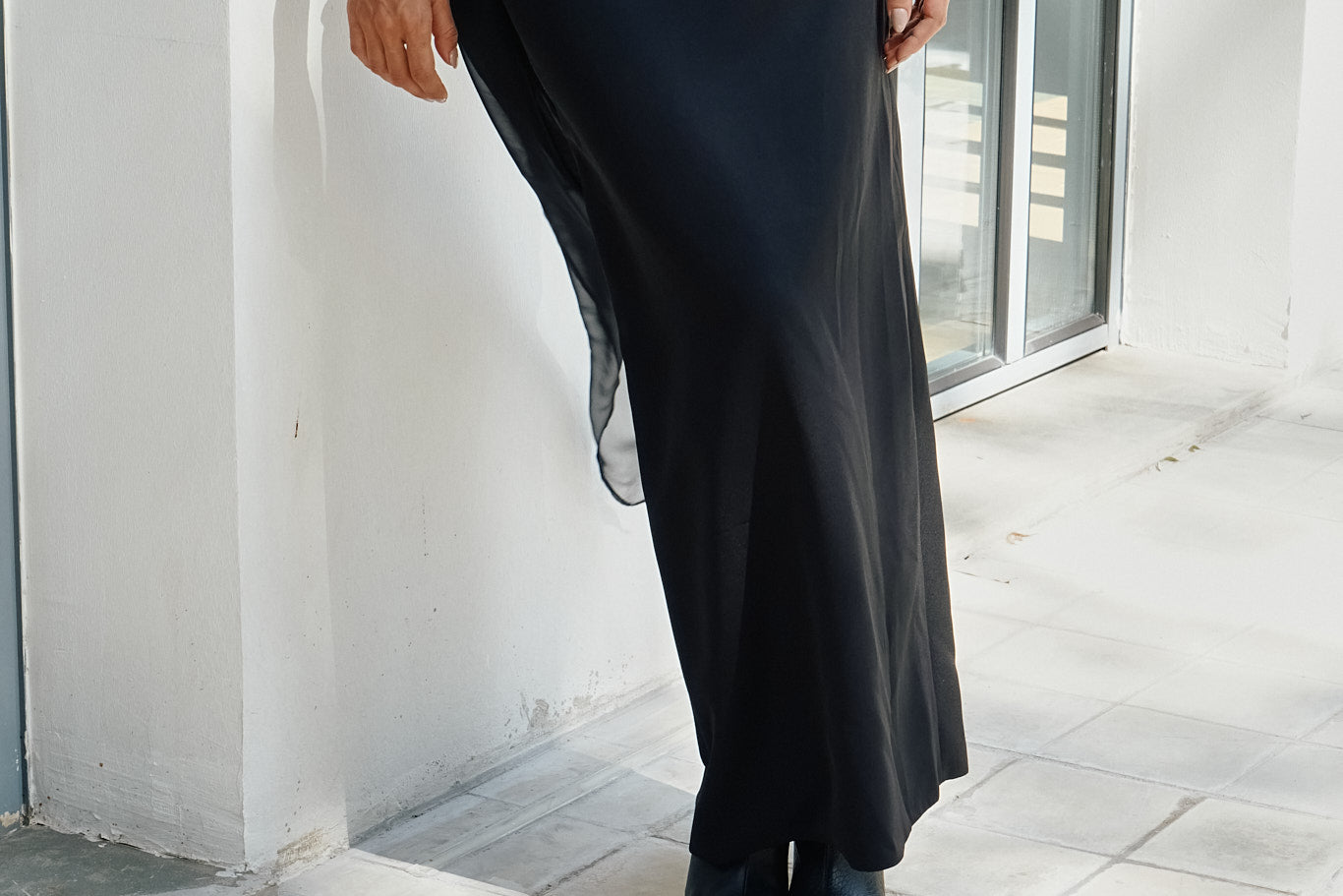 A high-waisted straight silhouette with a draped shawl on the bodice.