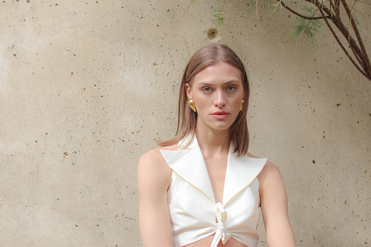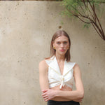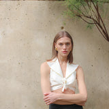 A sophisticated and sexy silhouette, the 'Blair' top is cropped silhouette that features peak lapels and a knotted bodice.