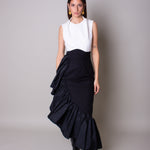 A high-neck top with large squared straps and folded detailing on the shoulders. It is highlighted by a row of buttons on the back.