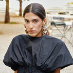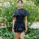A structured piece that adds an edge to your looks. It features cap-style short sleeves with intricate pin-tuck details at the bodice, with a slight flare at the hem.
