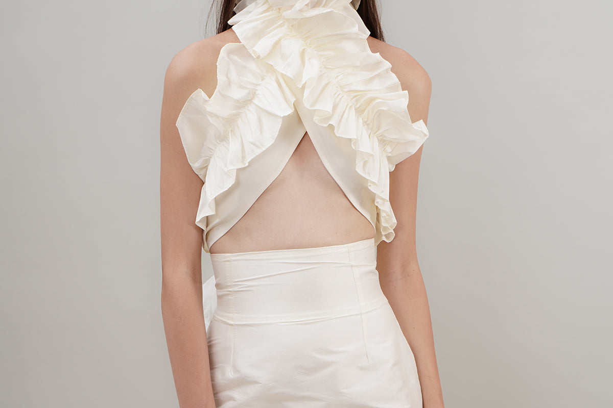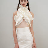 Our 'Sable Chaud' top is a size-free versatile piece. It can be wrapped around your body in different ways. It's cut from refined linen and features layers of statement ruffles. This top is size-free