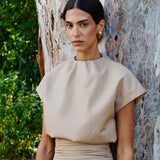 A structured silhouette with exaggerated shoulders and a cropped hem.