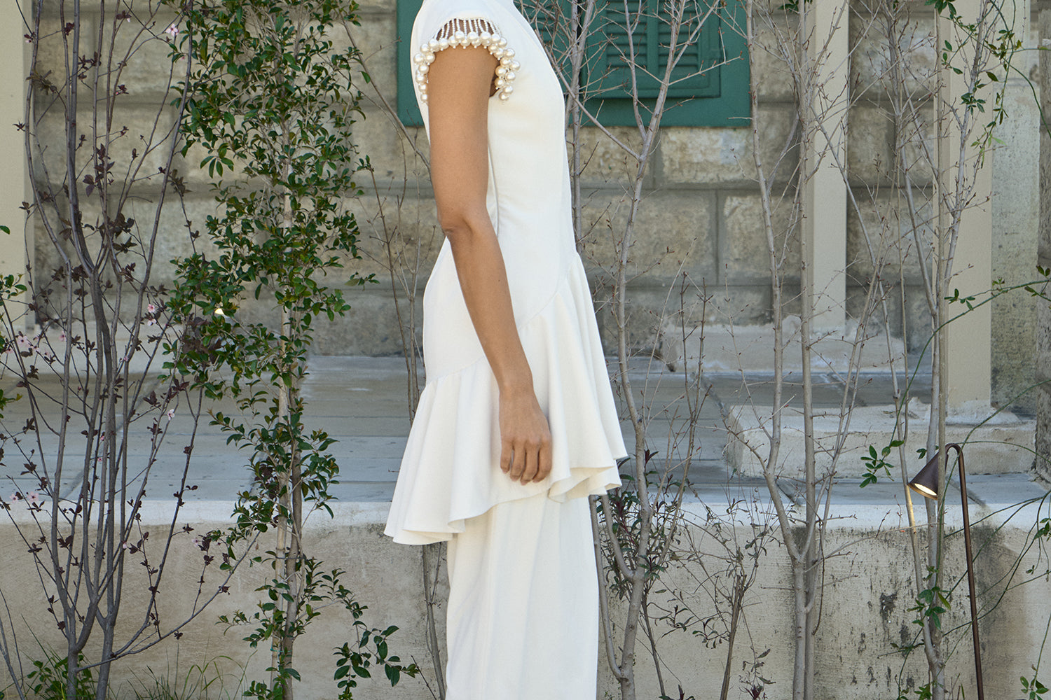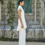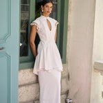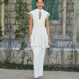 A unique column gown in an ivory shade. It features a high mandarin-style collar with a keyhole cutout and a drop-waist effect, and a peplum hem at the waist. A tailored fit adorned with beaded tassels on the sleeves.